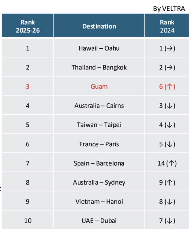 Recent data from VELTRA, one of Japan’s largest activity booking platforms, places Guam at No. 3 among the most popular overseas destinations — its strongest ranking in recent years – indicating a strong recovery as a preferred short-haul beach resort for Japanese travelers.